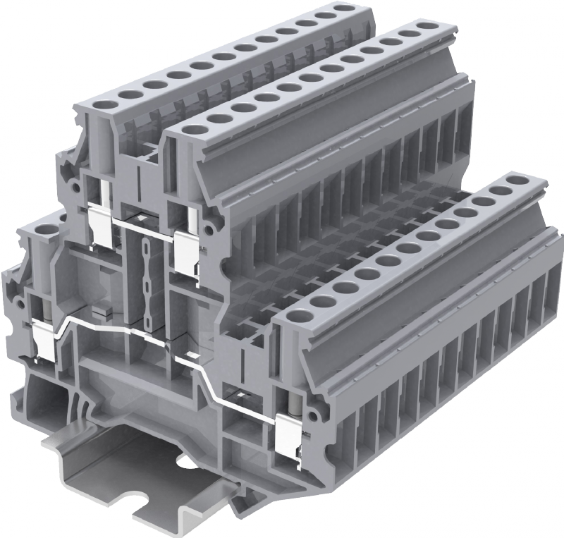 ОписаниеПроходная клемма двухуровневая SUPU TUD4 для монтажа на DIN-рейку серая. Тип соединения: винтовой.